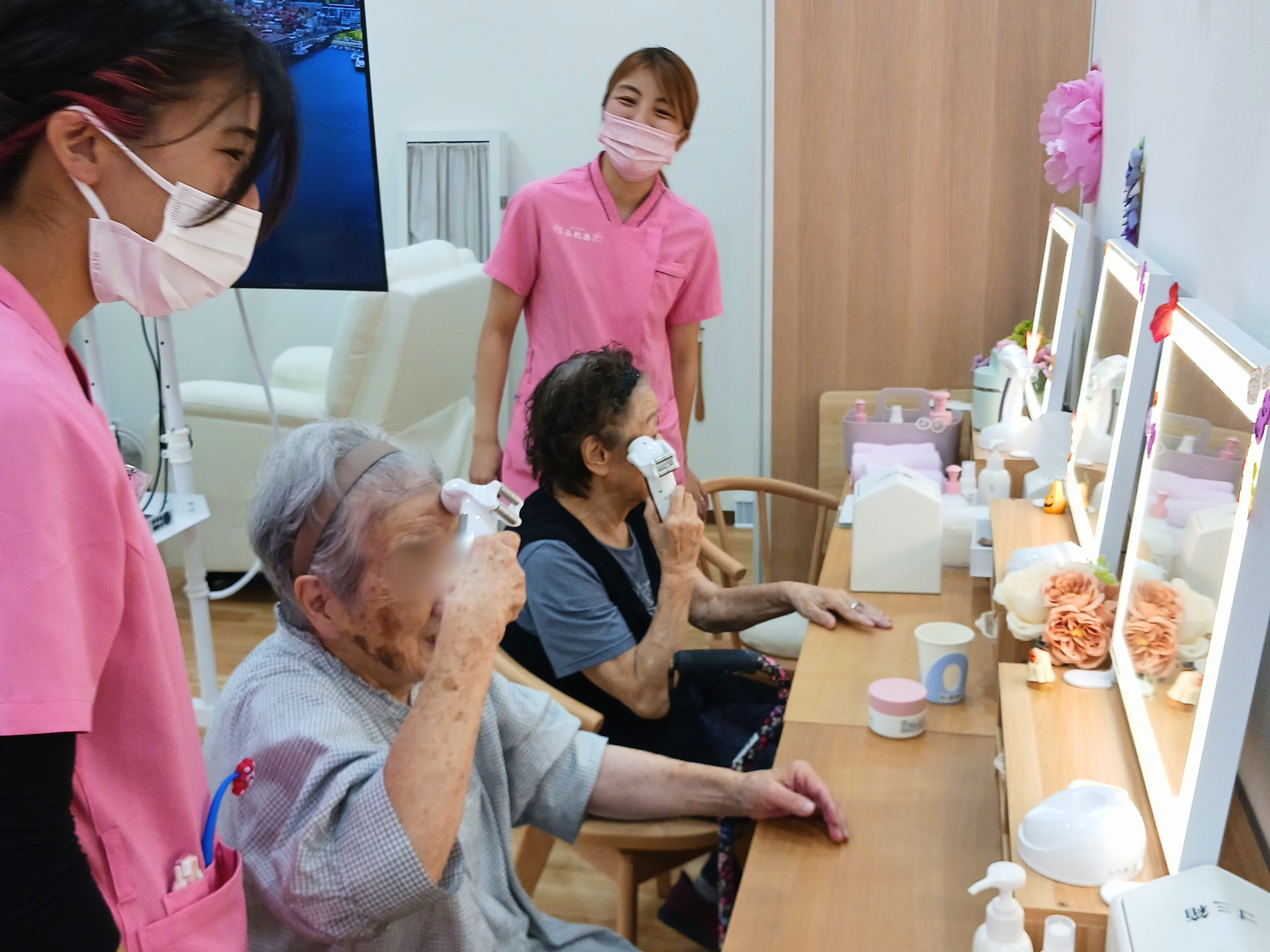 「これは気持ちいいわ〜」「ここに来れて本当に嬉しい」と喜ばれる方や、「お肌もちもち」と頬を触って実感される方も。美顔器の温かさに「あったかくて気持ちいい」と会話を楽しみながら体験される姿も見られました。
