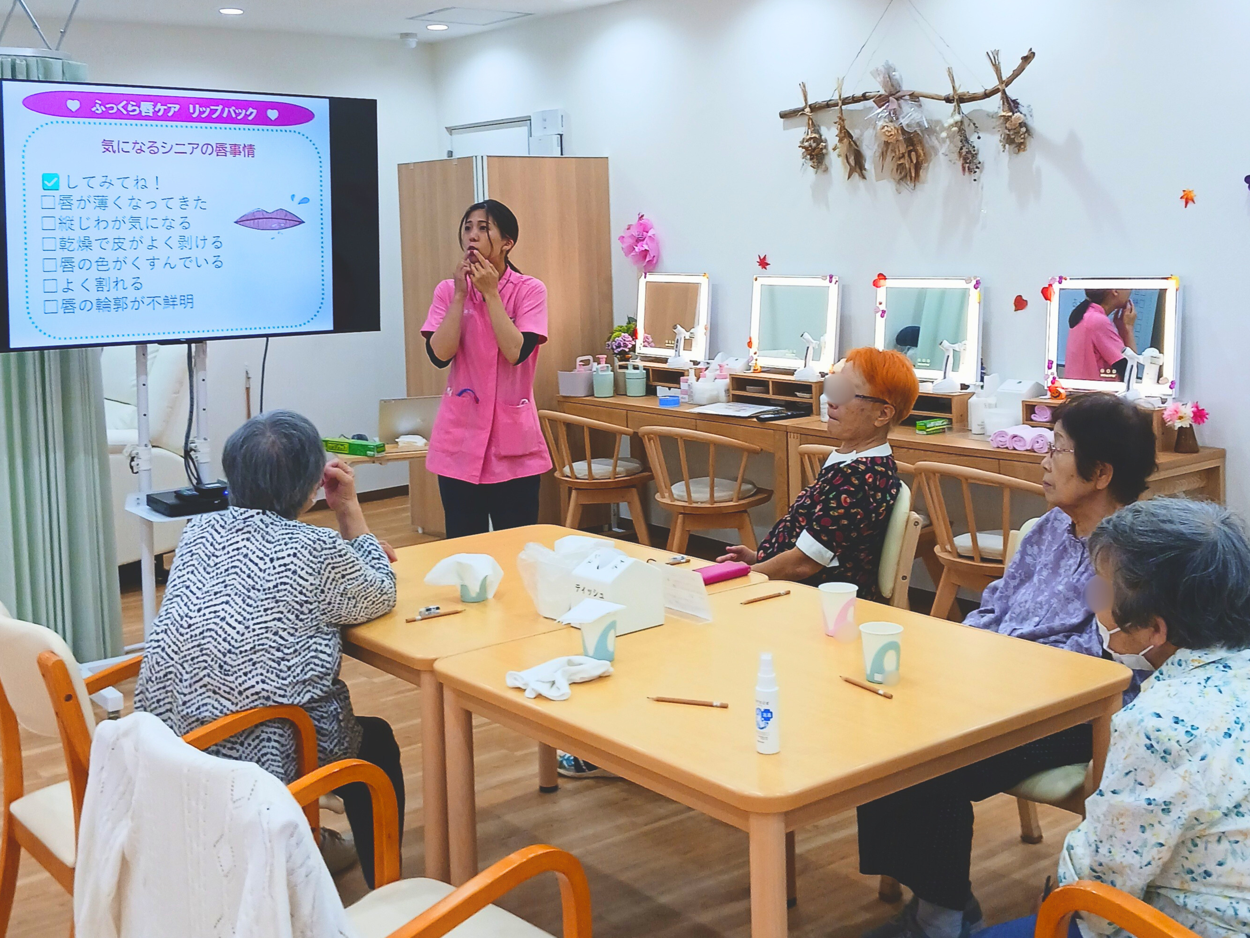 10月1週目のふれあ姫島では、くちびるのパックを中心に、皆様が笑顔で楽しむ美容レクの時間となりました。唇ケアの大切さや感染症対策のお話を交えながら、日常に取り入れやすい方法を学んでいただきました。