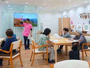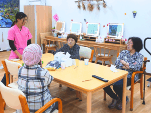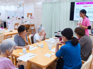 感染症対策のお話では、「湿度管理も大事なんだね!」「私もやってるよ!」と反応があり、学びながら実践につなげる様子も見られました。連想ゲームでは、秋に関するテーマで会話が盛り上がり、「紅葉が綺麗よね!」「温泉もいいね〜」と笑顔あふれる時間になりました。