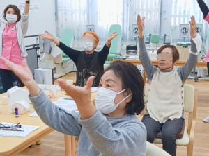 運動の時間には、「前はここまでやったのに、今はこんなに足が上がるよ!」「背中、真っ直ぐやね〜」と、ご自身の変化や周りの方の姿勢に気づき、声を掛け合う場面が多く見られました。