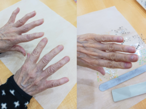 と、ご自身で磨いた爪を見て喜ばれる場面や、